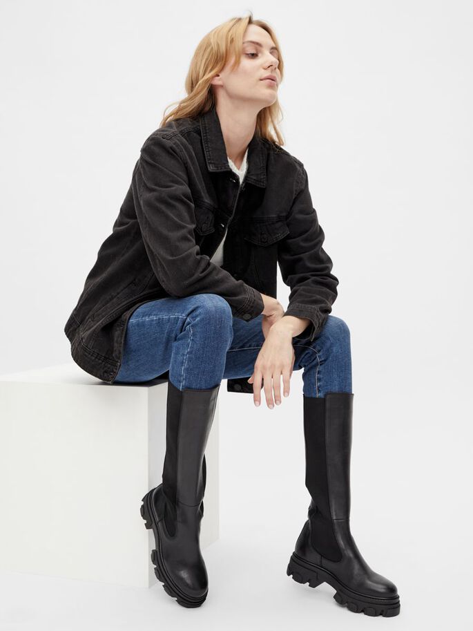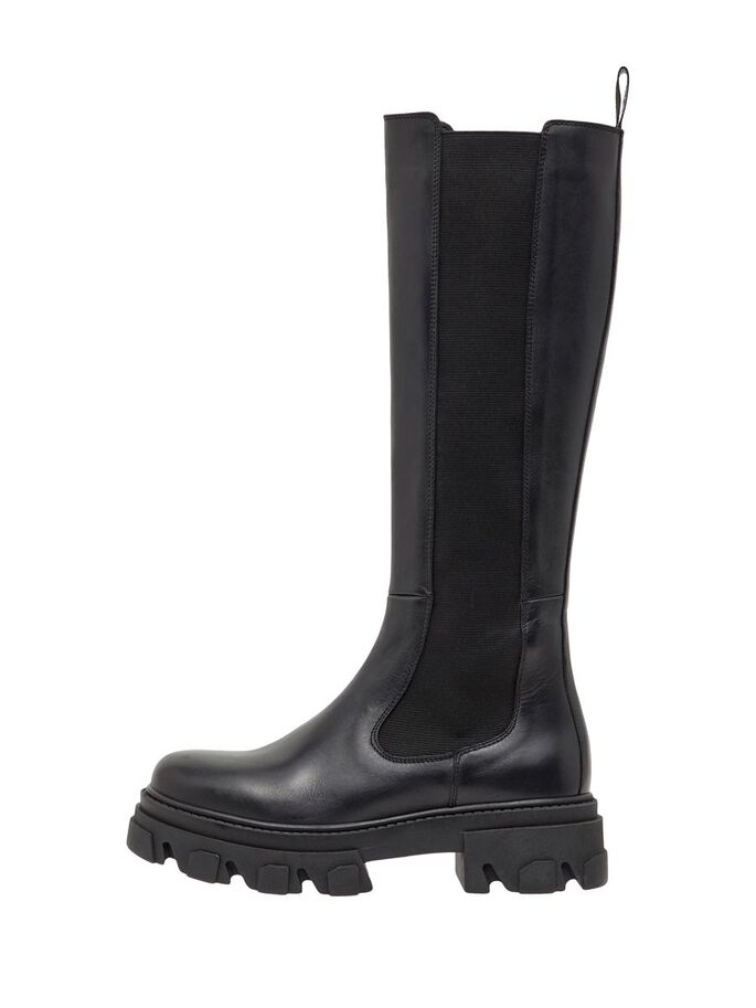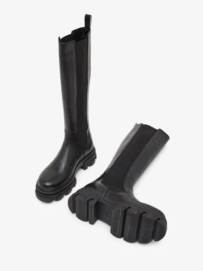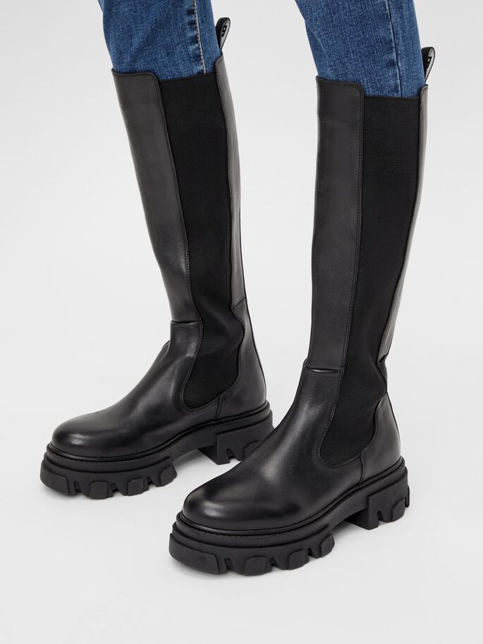 Women´shoes. Black Biando extra-long leather boots. Boots features elasticated side inserts and trendy chunky sole. Round toe.