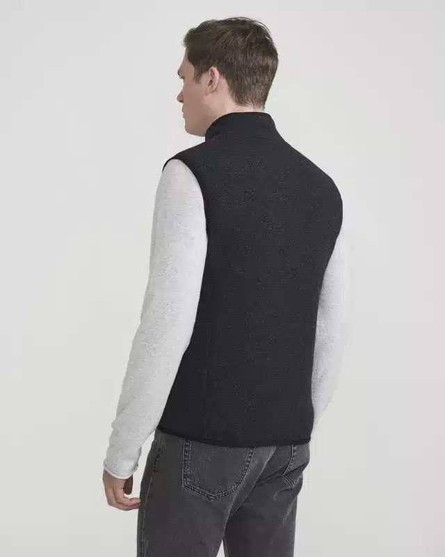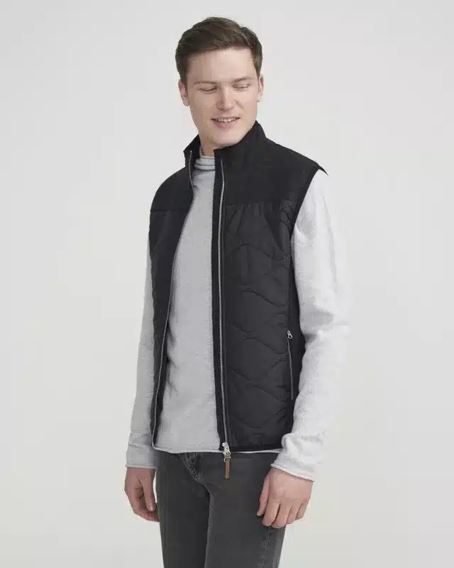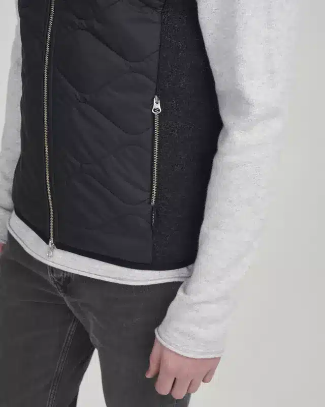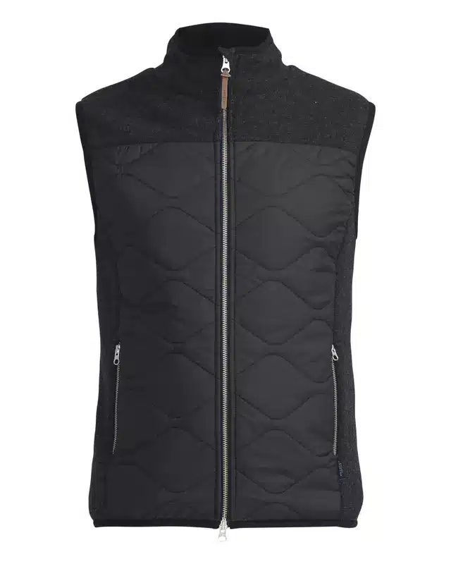 Combinated knitted and windproof vest in soft wool blend. YKK metal two way fullzip and two pockets with zip at side. The vest is made for activity and has elastic bounded edges to stay in place. Quilted Piumi fabric with wool padding (LavaLan). Elastic windproof lining.