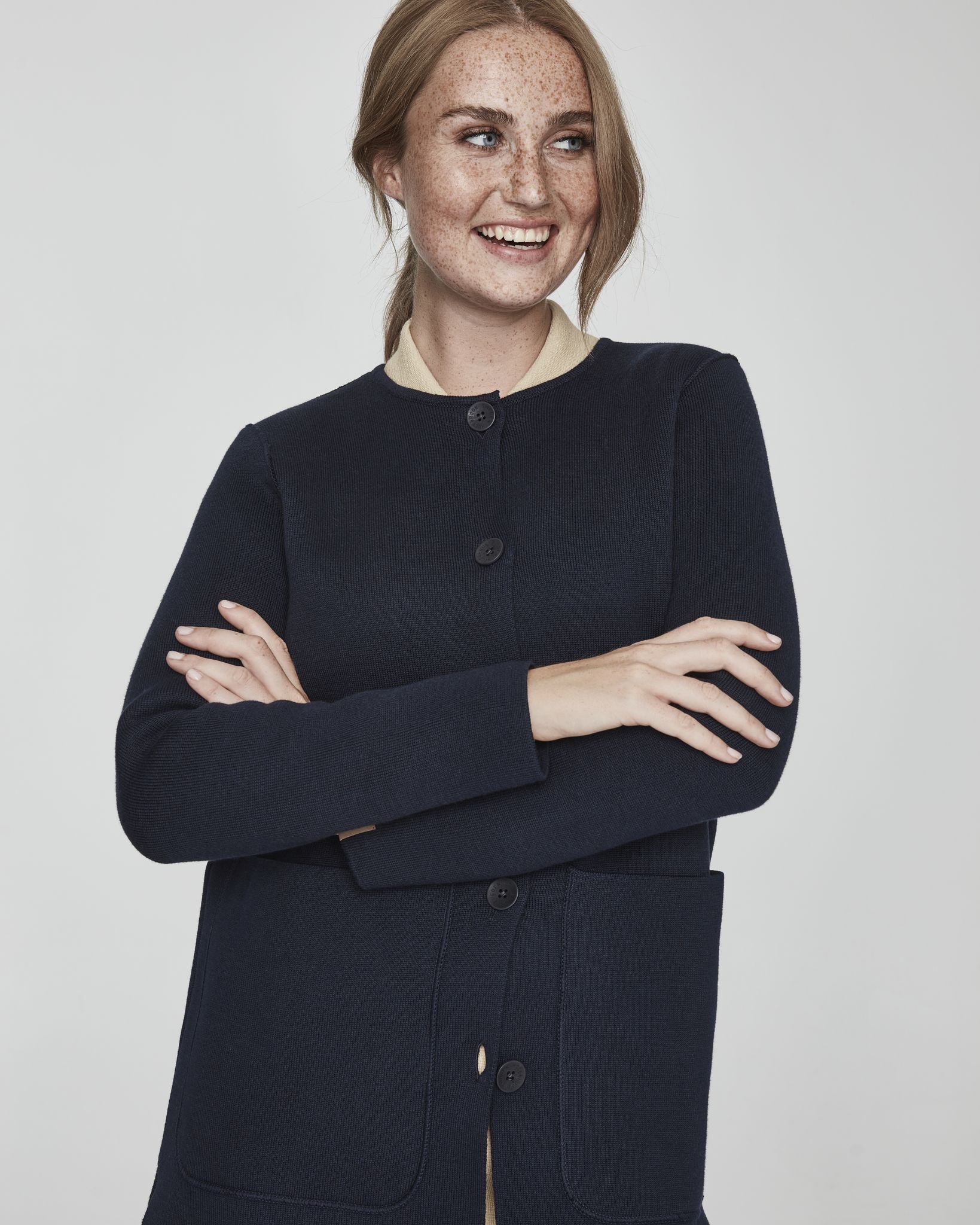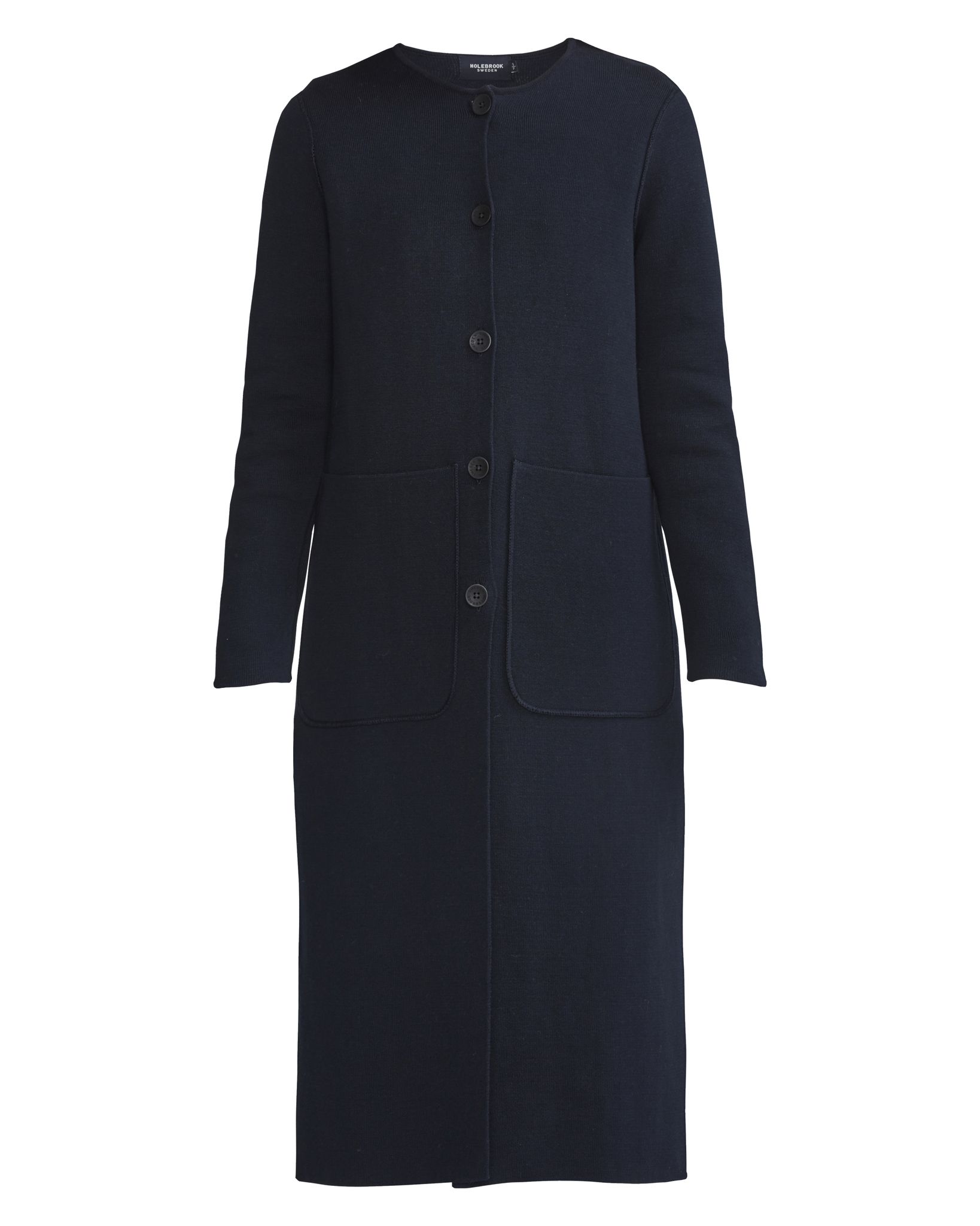 Women´s knitted coat. Long Holebrook double face coat for indoor and outdoor use. Coat features high slits on sides and big patch pockets on front. Button closure.