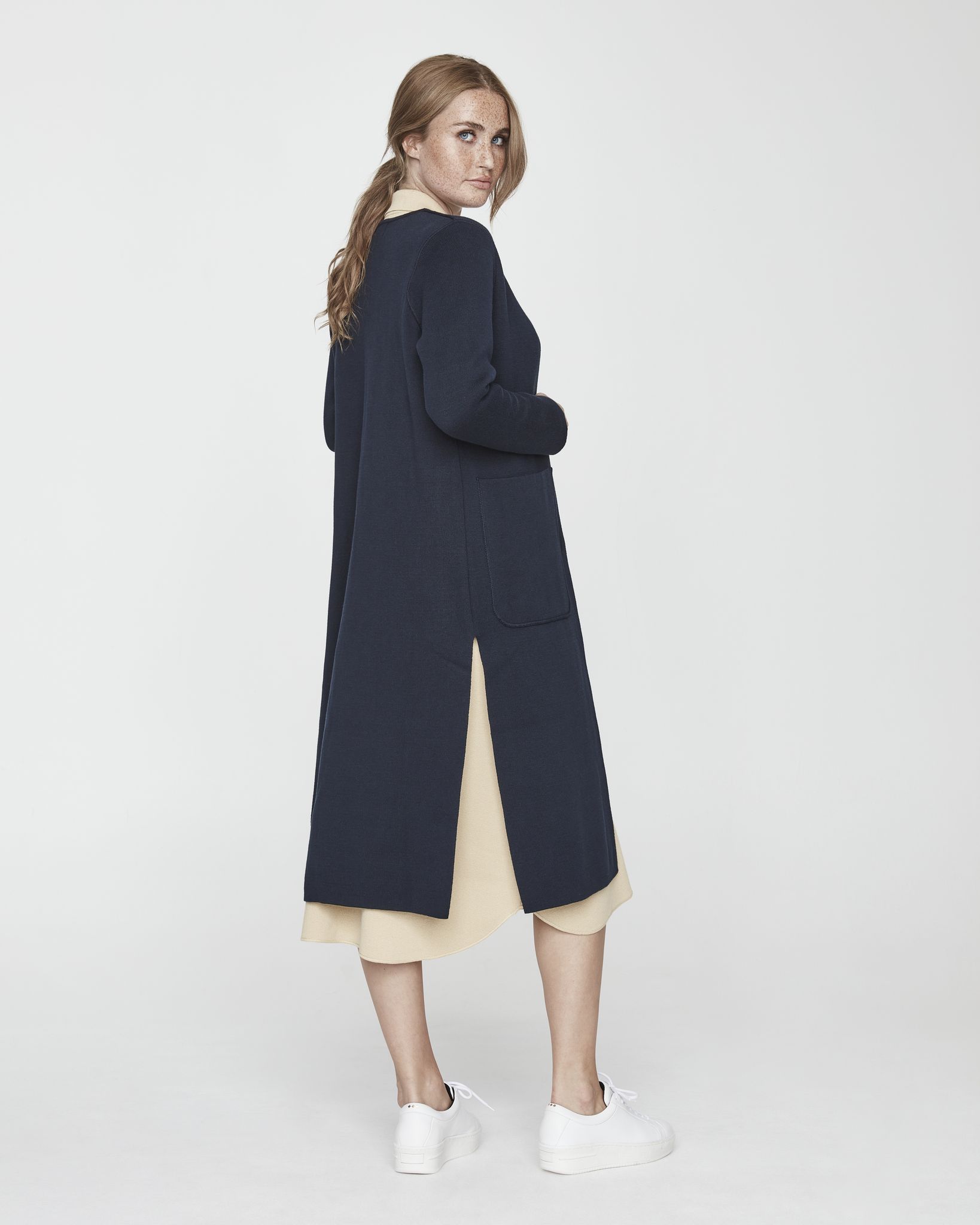 Long knitted coat for indoor and outdoor use.