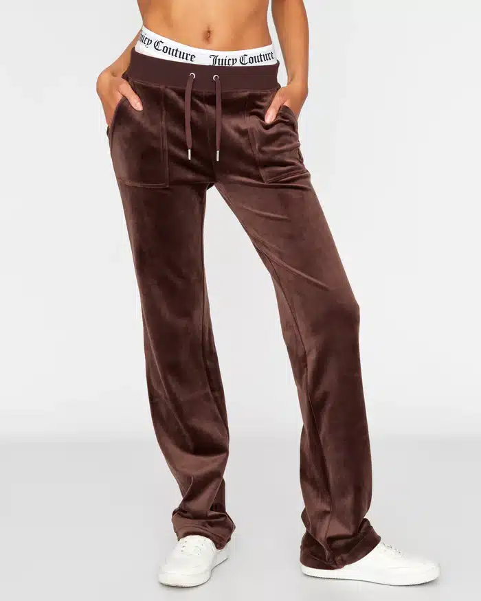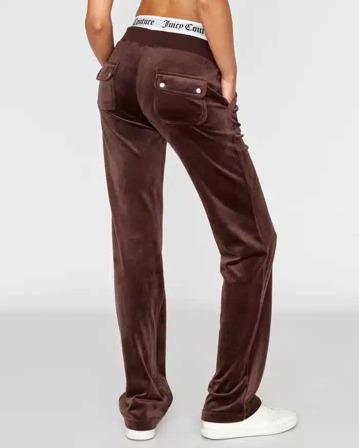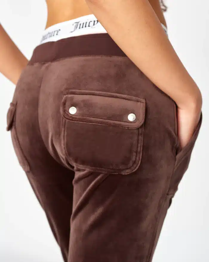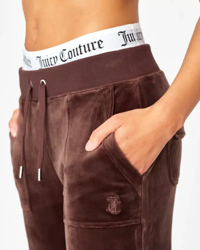 Juicy Couture High-rise plain tracksuit bottoms in classic velour. Pants features flared leg fit, with adjustable drawstring ribbed waist and front feature patch pockets. These core joggers feature back popper fastening pockets, silver branded hardware and are finished with a tonal embroidered JC logo at the hip.