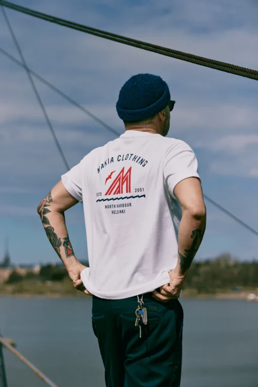 Makia relaxed-fitting unisex t-shirt made from 100 % organic cotton. The Särkkä T-shirt features the Merenkävijät print on the back and the chest.