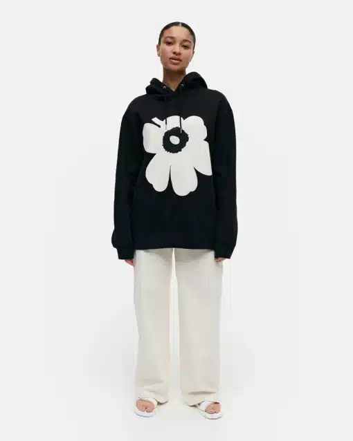 Marimekko Runoja hoodie is made of a thick cotton jersey blend and it features the large poppy flower of the Unikko pattern on the front. The sweatshirt has drawstrings to tighten the hood and it is of unisex design and sizing. We recommend choosing one size smaller than usual.