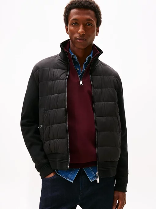 Tommy Hilfiger mixed-media zip-thru jacket features a quilted body and finely knitted sleeves.