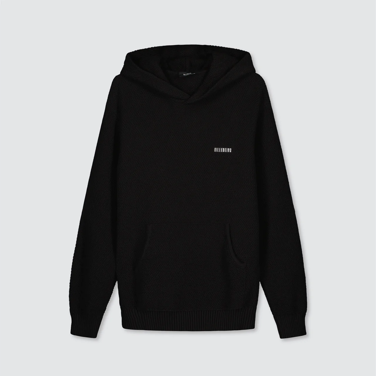 Billebeino knitted hoodie with Kangaroo pocket. Billebeino embroidery logo on chest. Ribbed cuffs and hem.